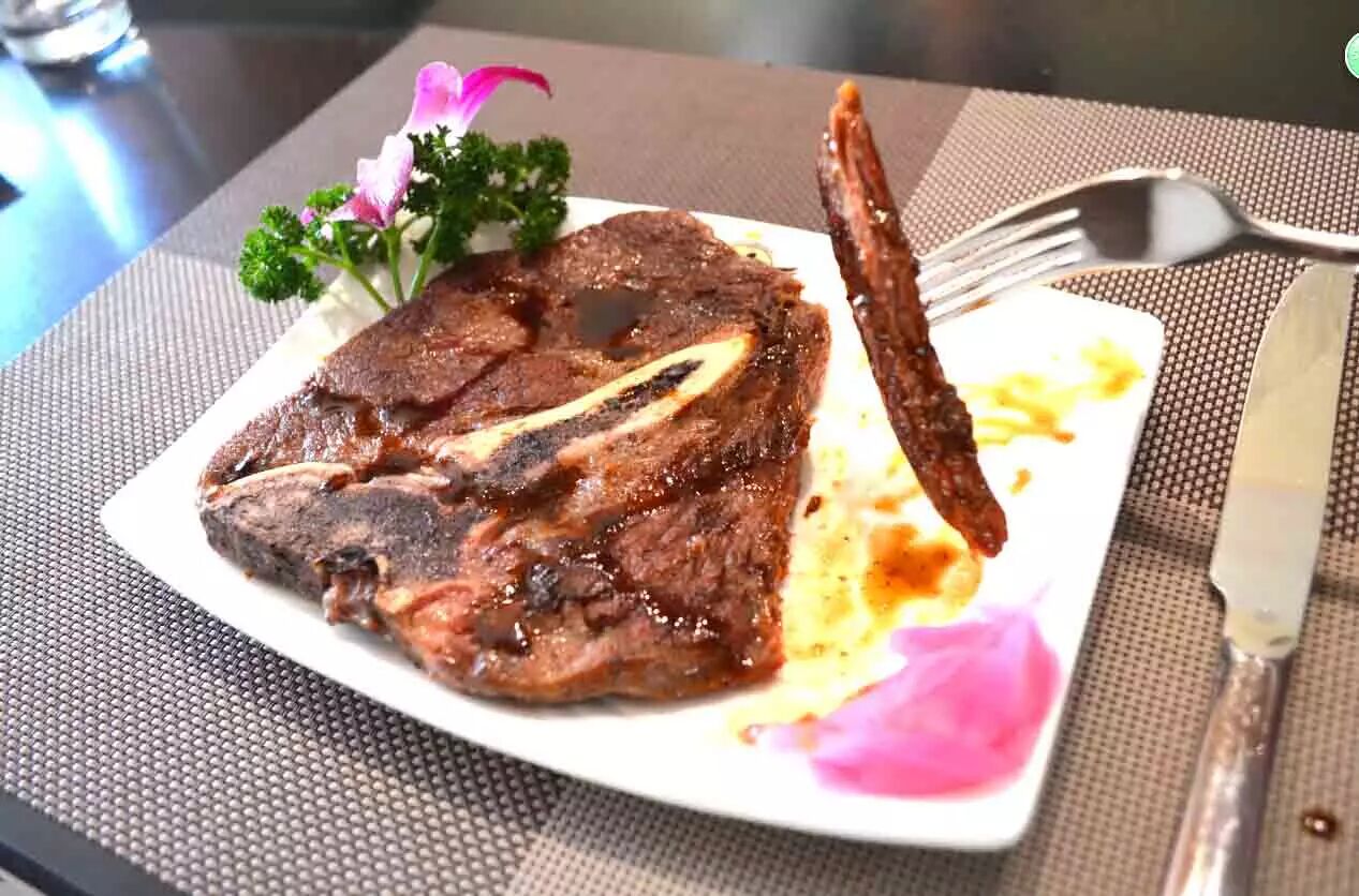 菲力牛排是牛脊上最嫩的肉,几乎不含肥膘,口感也是一级棒。因为肉质最嫩,所以三五七分熟都可以,不常吃牛排的话可以从吃七分熟的菲力开始。英尚的菲力还是正宗的T骨牛排,堪称极品啊!