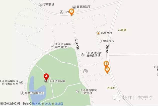 先来一张地图,途中标有数字的地方就是师院两个好吃街的所在地,标着数字2的地方就是北门好吃街,1、3就是东门好吃街。相比较来说北门好吃街吃的更多一点,而且更好吃一点。许多在学校非常出名的小吃都来自于北门好吃街。