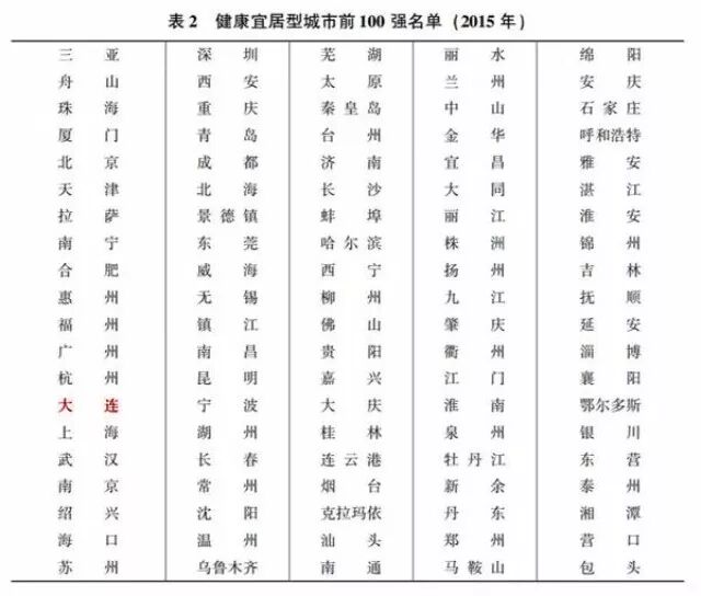 上述研究采用最新的2015年城市数据,2016年城市数据要到2018年才公布。研究依据健康宜居型城市建设评价指标体系,针对286个城市选择150个生态化进程发展良好的城市,分别对14项核心指标和5项特色指标进行计算,得出了2015年健康宜居型城市综合指数排名前100名。