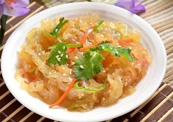 凉拌海蜇是一道夏日凉菜,海蜇凉拌后,质脆而韧,清凉爽口,是常用的佐酒佳肴海蜇具有清热解毒、化痰软坚、降压消肿等功能,对支气管炎、哮喘、高血压、胃溃疡等症均有疗效。