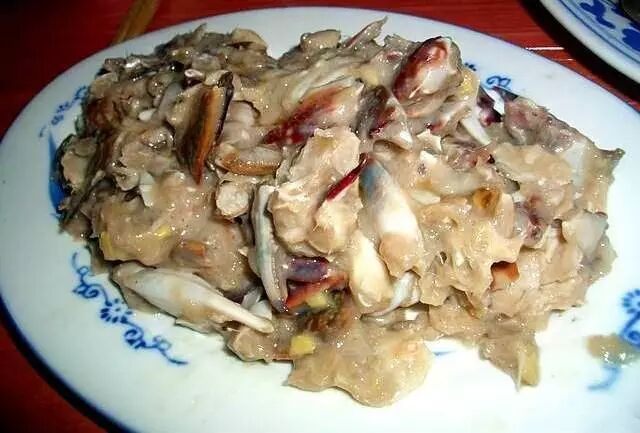 用刚捕捞上来的新鲜尖子蟹,剥去尖壳,除掉食囊、鳃脐,洗净疬水之后放在瓦钵之中,用擀面杖捣碎,拌以精盐,加几滴曲酒、少许姜末腌制而成的。因其味道鲜美,被称为“神仙蟹渣”。