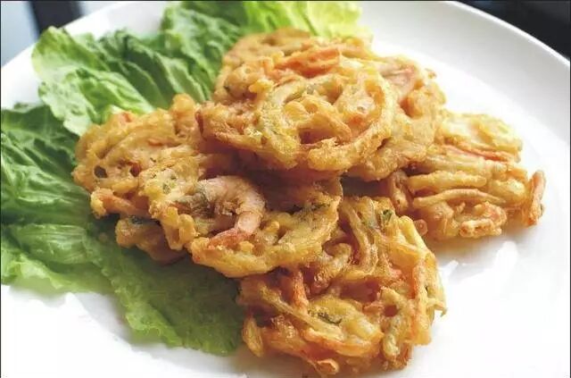 如东人常吃的白水虾儿,配上鸡蛋、面粉、香葱、盐味做成的面糊,油炸就成了。香喷喷,下酒又下饭。据说很“补钙”哦!