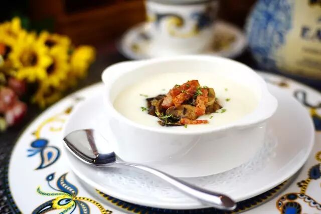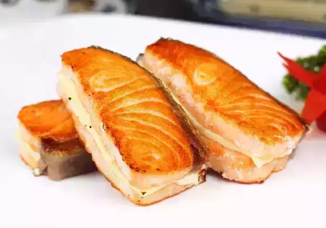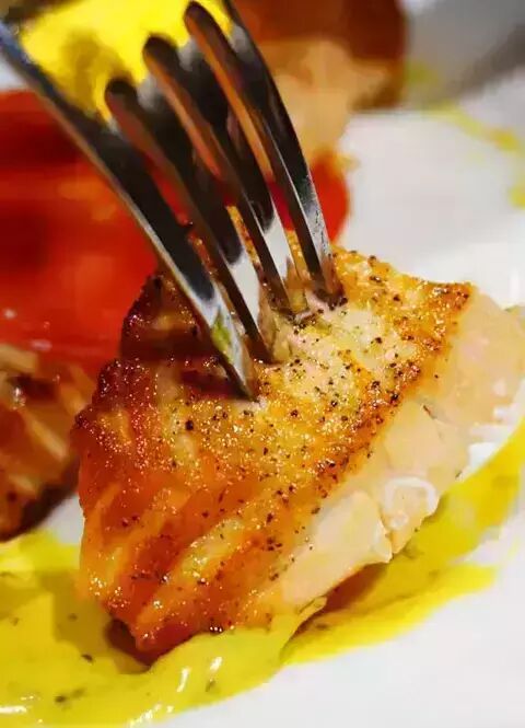 地道的法式浓汤,切细至果冻状的草菇粒混合幼滑细腻的忌廉汤,加上微微煎过的培根肉,即使第一次喝法式浓汤也不会觉得腻。铁板烧名菜,顾名思义是将黄花鱼风干一晚后再香煎的美味,肉质呈蒜瓣状,第一口就能感受到浓浓的海洋气息,然后是鲜嫩的鱼香,颇具回味。三文鱼向来都是我的爱,再加上味道浓郁的车打芝士,简直就是犯规啊!