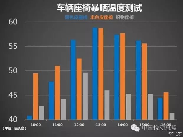 经过一天的测试,我把测试结果制作成柱形图来呈现给大家,方便大家解读。从图表中可以看到,两种颜色的皮座椅除了起始温度差别比较大外,在后边几小时的温度其实差不多,尤其是下午13点以后两车的温度基本一致,差别不超过2℃,说明皮座椅不论什么颜色,暴晒后的温度都是差不多的。