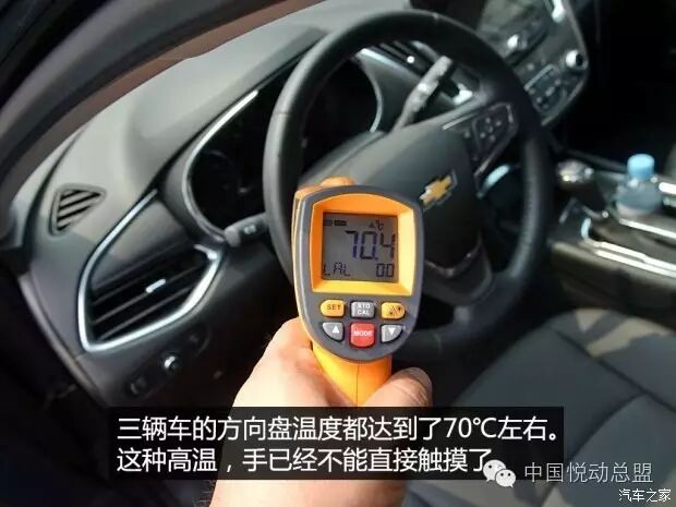 在这次测试过程中,我们还顺便测量了一下方向盘的温度,由于三辆车的方向盘都是黑色皮质,所以温度相差不多,达到了70℃左右,看来暴晒后的真皮方向盘温度要比座椅还恐怖。