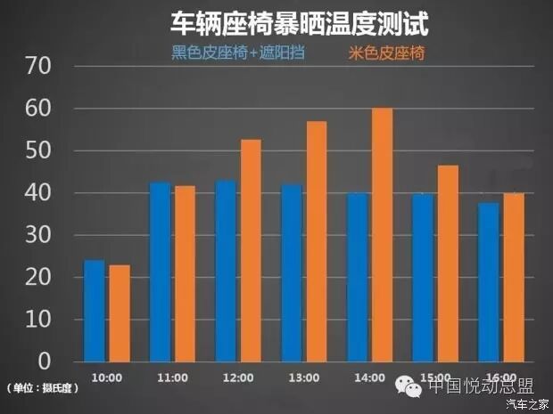 从测试结果的柱形图来看,安装了遮阳挡的黑色皮座椅车型(蓝色柱形图),温度的变化比较小,最高温度在12点时,达到了42.9℃,从12点之后,温度呈下降趋势,16点时温度为37.7℃,已经接近了人体体温。再来看没有安装的米色皮座椅车型(橙色柱形图),温度变化比较大,在14点时温度达到了60.1℃,比同时段的黑色皮座椅高出了20℃。从测试中可以看出,遮阳挡还是能够起到一定作用的。