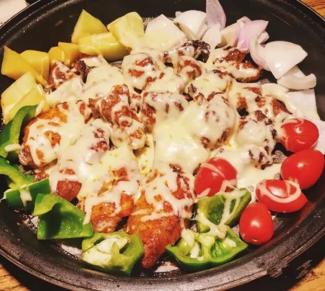 芝士烤鸡翅梅肉,厚厚的芝士下面藏着六个鸡翅和梅肉,配有青椒,洋葱,小番茄,菠萝。黄黄绿绿的很漂亮,看着也很有食欲!鸡翅烤的很嫩,有浓浓烤肉酱的味道,伴随着厚厚的芝士嫩嫩的鸡肉咬一口,味道绝佳!