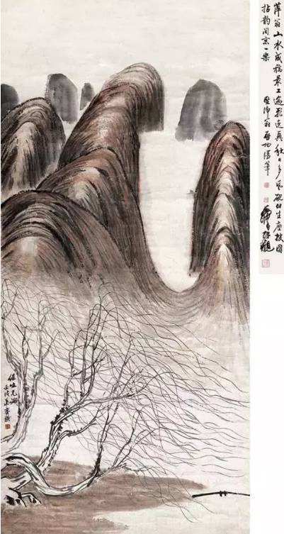 齐白石山水重写生、以大写意为主。白石老人曾经在45岁以后,“五出五归”,远游祖国大江南北,此《秋山图》是齐白石五十八岁时所作,经过逾三十年的苦心创作提炼,他已洗尽前人的面貌,将大自然的景观结合自己的个性,意境鲜明地自创一格。