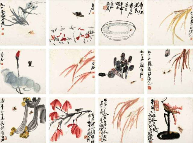 每幅皆有故事,虽然都是大自然中最普通的花鸟草虫,但是齐白石赋予它们一种永恒的美感,他以率真老辣的笔墨,鲜艳亮丽的色彩,生动自然的造型,以及他天真童趣的心灵和奇特的想象力,创造出一种大自然的律动,一曲无声的乐章。