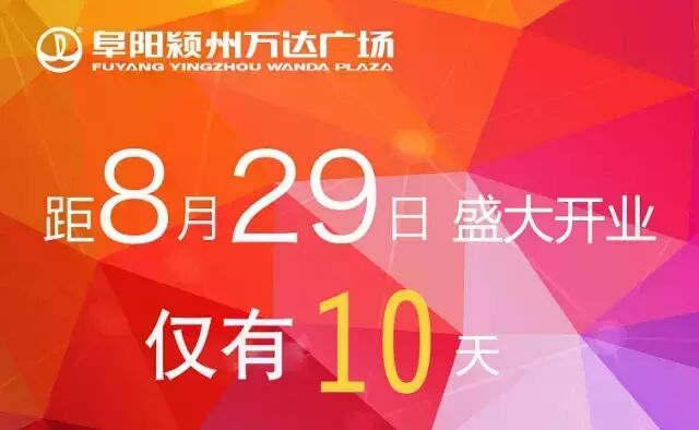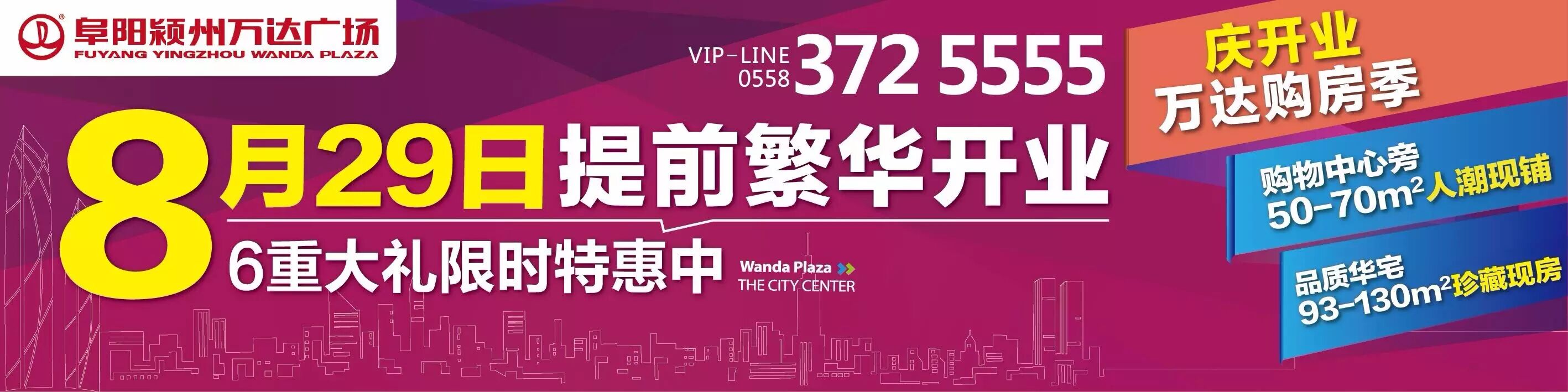2015年8月29日,阜阳体量最大规格最高的城市综合体颍州万达广场将盛大开幕,一站式全功能时尚家庭生活型购物中心,聚合时尚名品、风味美食、IMAX影院、潮流电玩、儿童乐园等缤纷生活美境,全新描摹城市繁华生活情境,打造时尚休闲生活全新体验。潮流律动的时尚新地标,永不落幕的欢乐主秀场,一段璀璨的商业传奇即将上演,将重新定义城市生活高度与奢想,实现您对时尚、休闲、娱乐、美食、购物的全新期许。开业期间,吃喝玩乐购一站式服务,全新时尚生活新体验,不夜城嗨翻天。