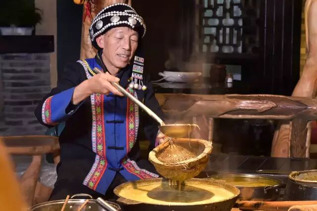 看着热腾腾的油茶,敲油茶的师傅介绍说,这锅油茶,茶叶采自谷雨当天的茶,因此又叫谷雨茶。谷雨茶,打出来的油茶色泽橙黄纯净,食之清香四溢,满口生津,妙不可言。