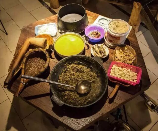 将茶叶、生姜、独蒜、油混合捶打出一碗芥末色的浓汤,既可以配上点心成为简单的一餐,也能配上各式菜肴待客。