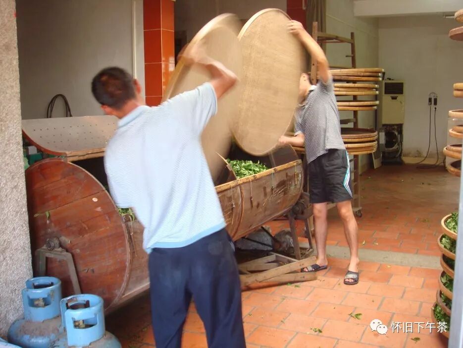 如果说泡茶是很具艺术欣赏度的,那么制茶的整个工序一点也不亚于它。茶采回来了,几大麻袋的茶叶被散开倒在院子里的水泥地上进行简单的晾晒,把叶子晒得稍显嫣枯之后,马上把他们移进一个圆形的木制滚筒里进行杀青,据说此程序可以使茶叶更为香醇。然后,经过杀青的茶叶被移出滚筒,薄薄地晾在一张张酷似养蚕用的大筛匾之中,一层一层地放置在专门制作的架子上,集中在一间密闭的屋子里,用抽湿机对其进行一整夜的抽湿。次日早上,再打开放置茶叶的屋门,把一架一架的茶叶缓缓地推到院子里,一筛匾一筛匾地端下来倾进自筑的炒茶机进行精心的烘炒。接着,就到了最为烦琐最为磨人耐性的一道工序了,此工序由过去的“走脚球“演变而来,现在早已有包揉机来取代了,就是用一块块布把炒好的茶叶包起来,放在一个旋转机上一圈一圈地转动,随着机器的转动,那包茶叶就会被越裹越紧,状似一个大南瓜,裹紧实了的一包包茶叶又被放置在包揉机上进行一圈一圈的旋转式滚揉,此程序就是为了使一片片舒展着的茶叶卷曲起来,成型。嫂子介绍说,这一烦琐的工序最少要反复重复二十几遍,这让我禁不住对每一位吃苦耐劳的铁观音茶农产生了由衷的钦佩。最后,卷曲缩紧了的茶叶被放进筛选机内进行筛选,细碎的茶沫被筛出弃掉,留下大而漂亮的茶品,再对其进行烘焙,使茶叶最终完全烘干并定型。制茶的整个工序到此为止,茶农的活却依然未完,他们不但要操心茶叶能否卖个高价钱,并且次日早上还得继续去采茶。制茶的工序是繁忙而紧凑的,依各家茶田的多少而论,据说一个采茶季一般要忙上半个月到一个月不等。
