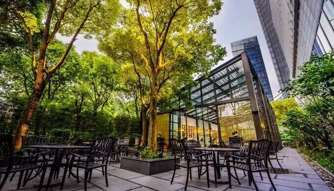 欧式风情十足的黑铁座椅散落在颇有质感的石制地面上,周围绿意葱茏,是城市里的绿洲。透明玻璃和半露天的设计让非常别致梦幻,周边花园景致被完全网络其中,无论在室内还是室外,都会给你最有品质的休闲时光。
