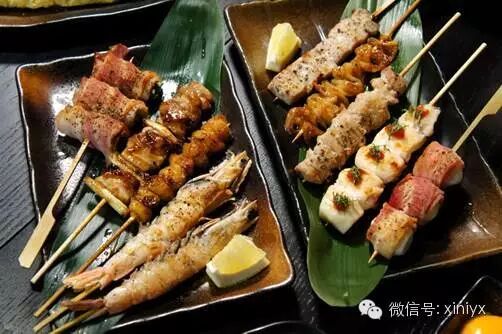 · 鸡肉、牛肉、虾、鱿鱼串烧