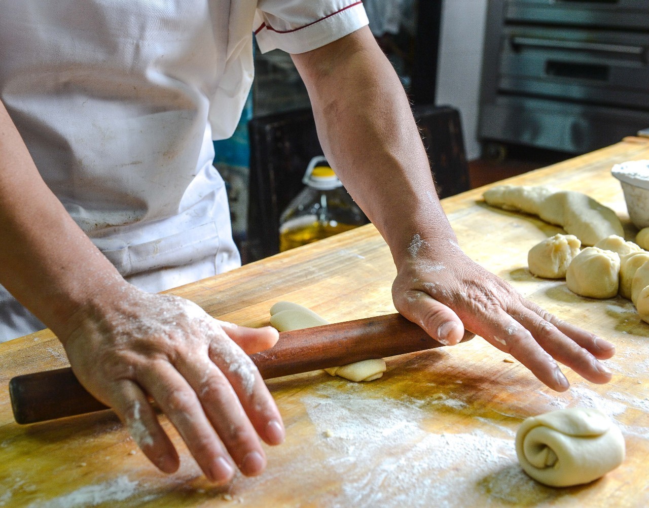 油加热水和面,搓丸子,裹油酥,经验老道的师傅都知道,擀面的时候手法一定要均匀,这样油酥才会是一层一层的。
