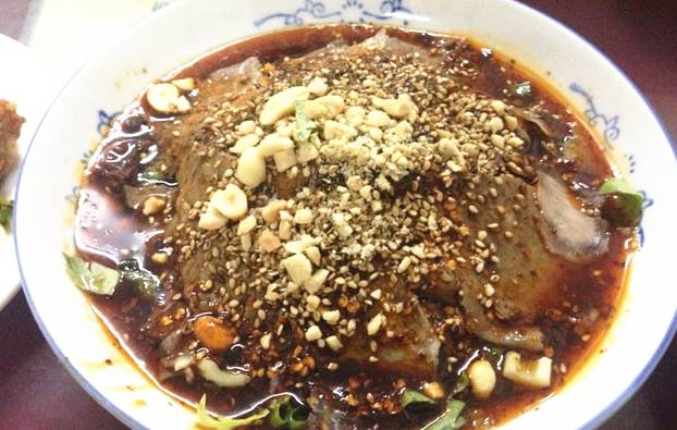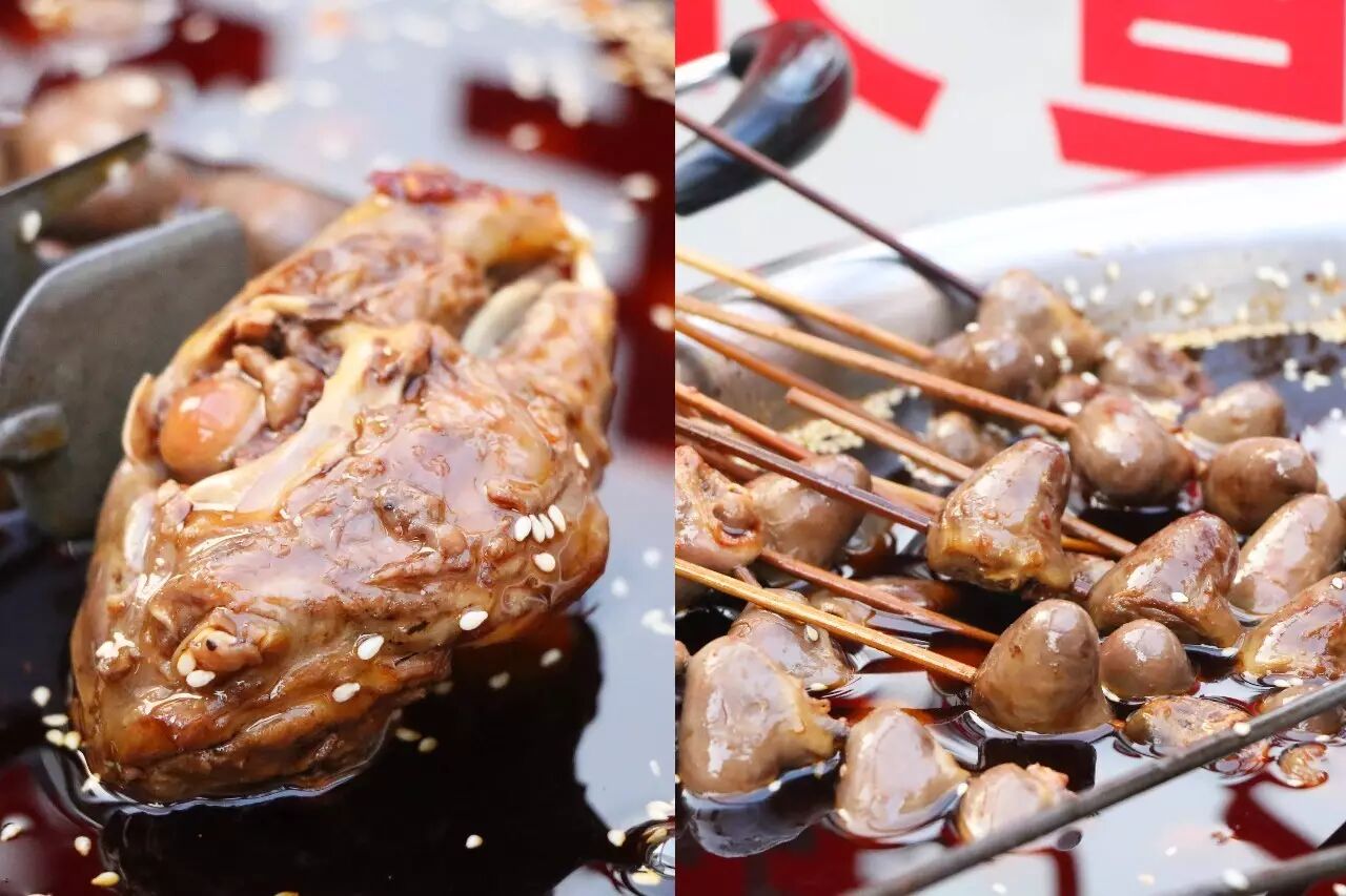兔头、鸡心子泡在一口装满的红油小盆里,随时吃都是味道足足的,麻辣鲜香,啃起就停不下来,其实牛杂吃胀了都想再买几个边走边吃!