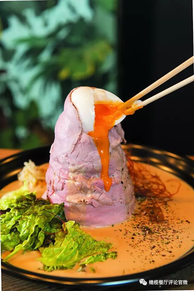 自从年轻人及OL 们开始流行玩各类社交媒体之后,日本的餐厅在设计新菜式时,都花尽心思,务求食物造型亮眼突出,吸引食客们拍照,再放上社交平台跟朋友分享,从而吸引更多的客人。Volcano Kitchen的店主アフロさん(爆炸头先生)坦言,设计这座“火山一样高耸”的烧牛肉丼时,确实有想要让大家觉得有趣并成为话题的意思。而这道菜也确实做到了——让我觉得最有趣的地方,除了将烧牛肉包住白饭堆成像一座山一样高之外,就是在“火山口”放了一只半熟蛋!吃的时候先将蛋戳破,蛋黄浆便如火山爆发一样流出,造型逼真,画面相当震撼!