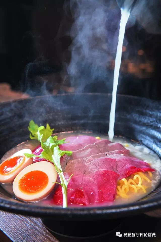 这里的店长表示,老板拥有一家烧肉店,一直有供应神户牛肉,去年他想搞点新意,做点比较创新地牛肉料理,便开了这间应该是全世界第一间上台时还是“生肉”的神户牛肉拉面店!跟普通的拉面店同样,都是等客人点单后即时烹制,师傅先将煮好的面条放于碗内,再铺上生切的神户牛肉片,同时,店员会将一壶以100%神户牛牛骨熬成的牛骨汤送到客人面前,由食客自己将清汤缓缓倒入碗中,将牛肉片烫熟。