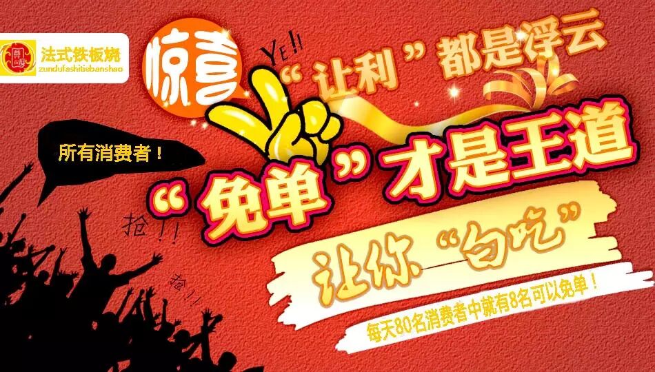 注:每次获得免单的顾客将通过尊度法式铁板烧微信公共平台公布,所以一定要记得关注我们的公共号哦!更多的优惠活动将从我们的微信公共平台发布。