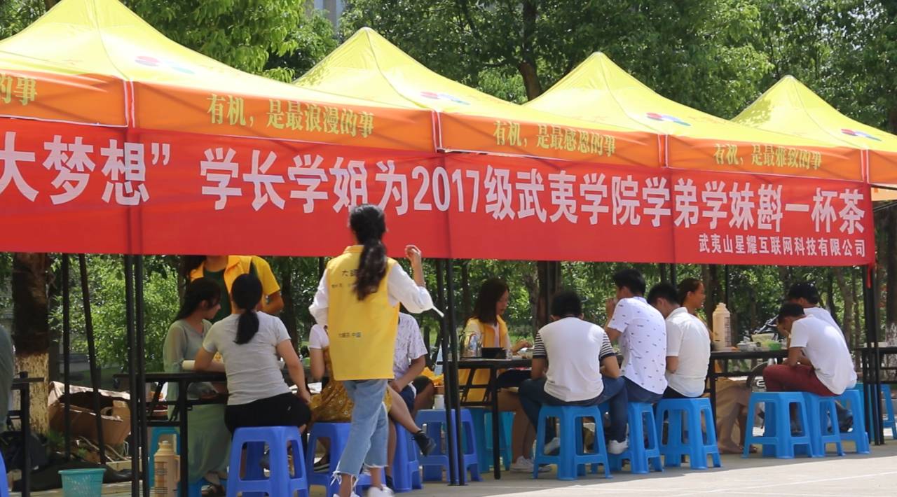 大罐茶武夷学院校园创业团队工作人员为学子们及其家长提供接待服务,筹备一系列活动,为武院莘莘学子答疑解问,展现了当代学生敢于创业、不断创新、持之以恒的精神风貌。