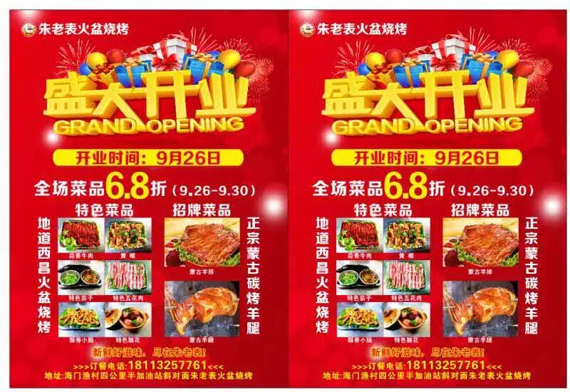 小伙伴们,注意啦! 西昌朱老表烧烤明天开张啦!!今晚,我们在朱老表烧烤不见不散!今晚朱老表疯了,全场菜品6.8折!!