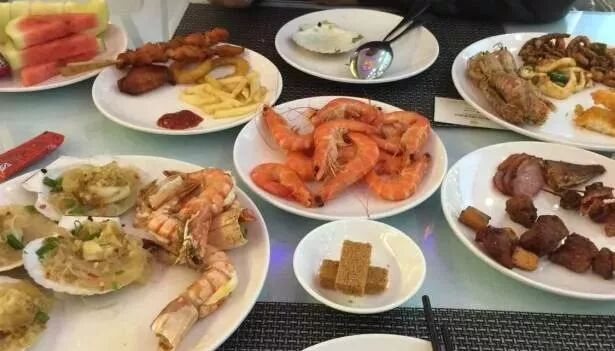 网友点评:环境和服务不必多说,毕竟价格在那里!主菜是芝士焗虾、大闸蟹、鲍鱼。凉菜也很精致,饮料也很齐全,果汁酸奶鸡尾酒应有尽有,强力推荐现磨咖啡,服务很周到,牛排不限量。