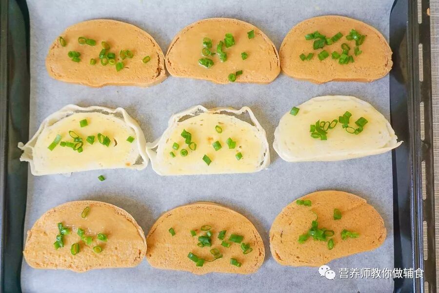 8、时间到了,取出烤盘,再翻一面刷鸡蛋液和葱花,再入烤箱烤10分钟左右;PS:如果切得薄或你的烤箱温差大,记得减时间,不够再加,多观察一下;这个时间烤出来是外酥里嫩,如果喜欢全酥,可烤久一点点;