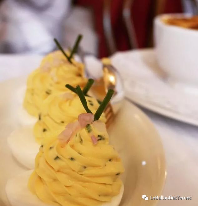 oeufs mimosa,此处姑且称它为蛋黄酱蛋蛋吧,高高铺满蛋黄酱的半颗煮蛋,