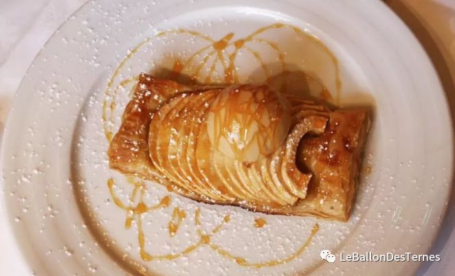 介于高调华丽与质朴美味之间的,就要属这道千层烤派配香草威士忌冰淇淋球(Mille feuille à la vanille Bourbon)了。千层可以说是法国人最爱的甜点之一。而厨师奇思妙想,结合了烤派的做法将新鲜苹果放进蛋糕胚之中一起烘烤,果香与奶味在几百度的高温中互相胶着,缠绵悱恻,最终被一起包裹在千层酥脆的外皮之下,仅在上方简单的点缀着酒香四溢的香草冰淇淋。一勺下去,千般口感,多种食材的美好让我想夸赞都找不到真正能够完美表述的立意点,也只能硬生生憋出一句“我去,太好吃了吧,让我再来一口”。
