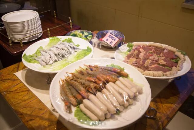 肥牛片、潮州牛筋丸、南口贝、阳山扇鸡、麻虾、三文鱼刺身、生蚝等,