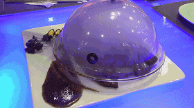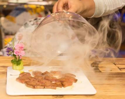 这道烟熏菲力牛排就是采用了分子料理中的用具——分子烟枪,可以使食物在短短的一分钟内达到果木烟熏的效果。掀开盖子的瞬间,轻薄的烟雾四散,仙气十足,十分神奇。
