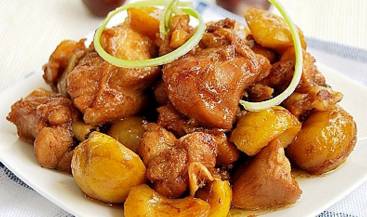 鸡全腿1个,栗子200克,白糖一小匙,生抽,料酒各1大匙,老抽1小匙,盐适量,葱段,姜蒜片适量。