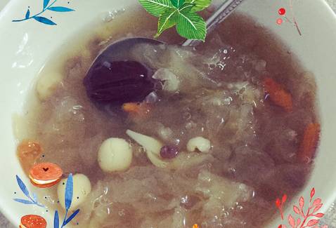 银耳5-6朵,莲子1小把,芡实1小把,薏仁1小把,干桂圆4粒,枸杞15粒,冰糖适量,干桂花一小撮。