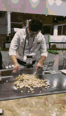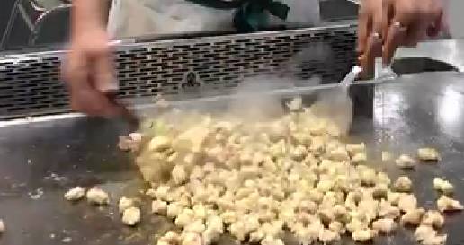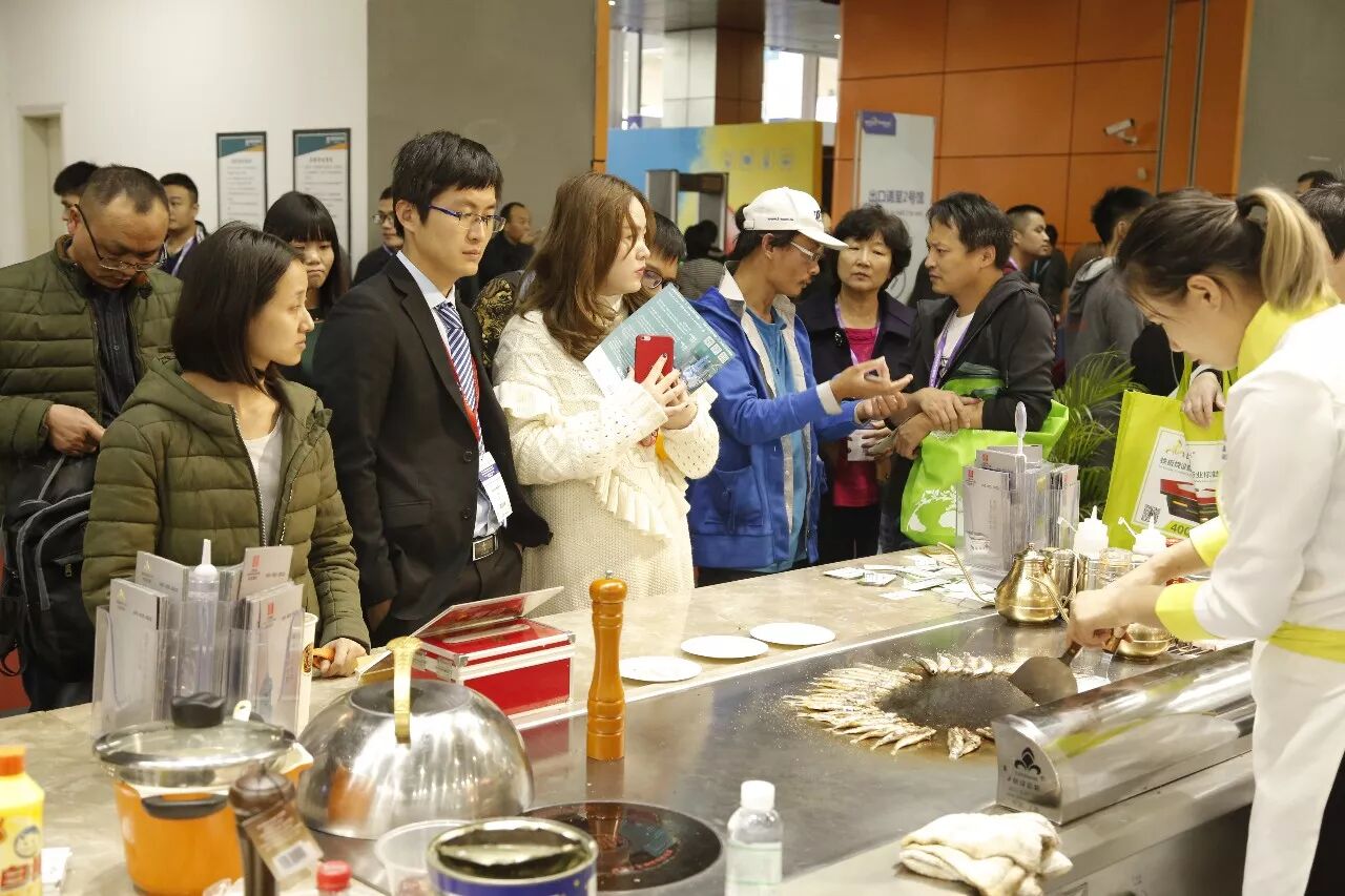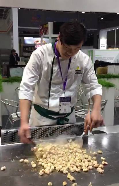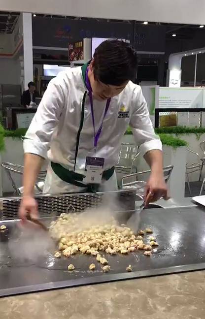 现场铁板烧美味制作中;翻炒产生的油烟在出来的瞬间就被弧形吸风口吸走了