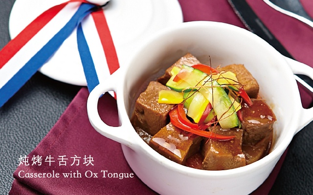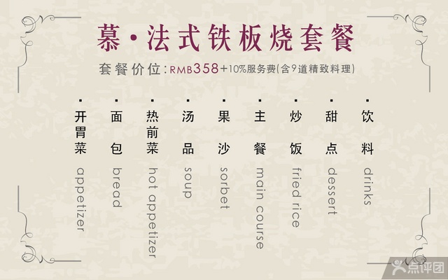 2、套餐含九道精致料理(开胃菜、面包、热前菜、汤品、果沙、主餐、炒饭、甜点、饮料)。