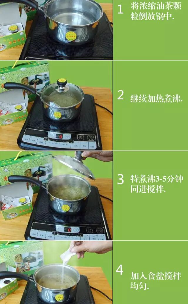 在锅内加入3-4碗水,将浓缩油茶颗粒倒入锅内煮沸5-10分钟(时间长点更好),稍加搅拌,一锅黄橙橙,绿油油的正宗油茶就像呈现在您的眼前。随即加入食盐,配上佐料、点心等,趁热饮用。也可以将肉菜放入煮好的油茶汤中,煲成油茶鲜汤饮用。