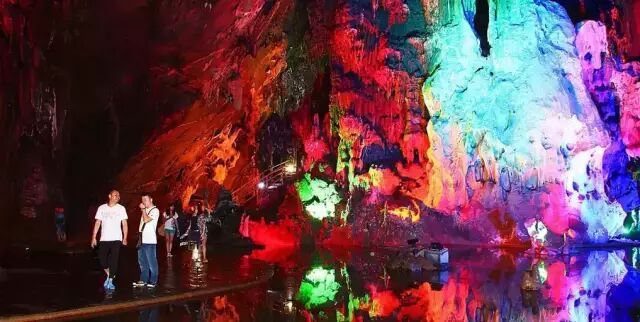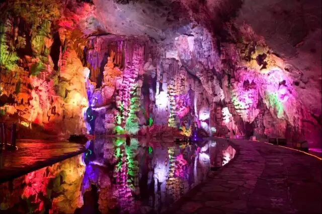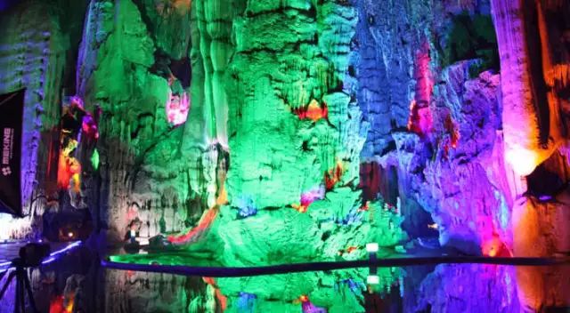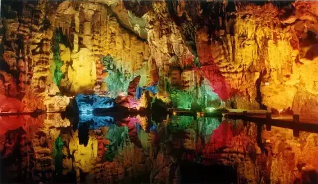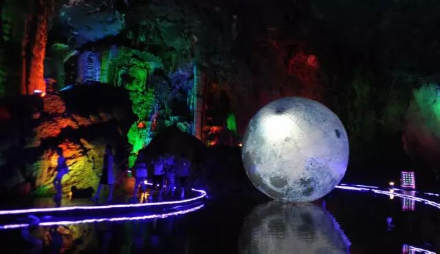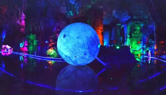 幽深神秘的亿年古溶洞里,几个巨大的星球模型熠熠生辉,倒影在长长的地下河,疑似银河落人间,溶洞上方巨大的空间,各种岩石的纹理折射着星云般的光线,充满奇幻,游人恍如走进了星际迷航世界,美不胜收。
