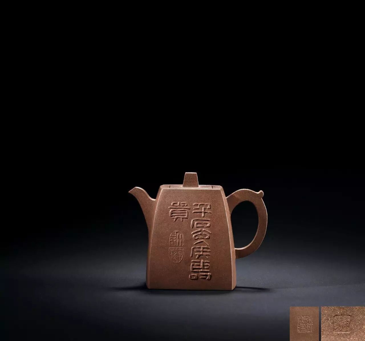这件瞿子冶铭申锡制段泥汉方壶,系紫砂文人壶之典型。壶以段泥制成,古朴典雅,壶身有子冶行书铭文“旦夕畅饮三杯,身心了无一事”,茶禅一味,耐人赏玩。另一面则许梿隶书仿汉砖文“千石公侯寿贵”, 后以木模压制“许”、“槤”连珠印款,金石意十足。子治申锡合作壶多见于博物馆收藏及资深收藏家秘玩,茶禅一味,耐人品玩,因此更显得弥足珍贵。1987年台湾出版的《宜陶之旅》一书中收录有此壶。