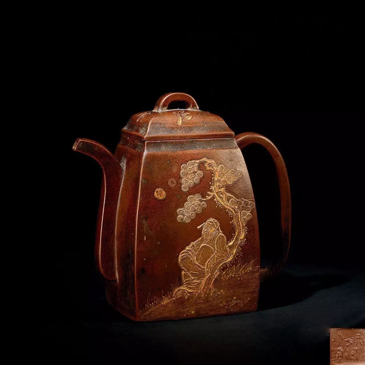 此壶壮硕大气,呈扁方形体,壶流呈四方状,并以四分之三平贴壶身,把圈寓方,钮为桥梁式,盖身平面皆正方,向下愈来愈阔,壶盖密压盖口吻合。壶身一侧泥绘高仕倚松观月,另一侧泥绘竹石图。壶体端庄肃穆,气息高耸大度,雄浑肃穆,是清代典型流行壶式。圈足内有篆书款识底钤“荆溪华凤翔制”印款。汉方壶乃紫砂古式,明代周高起《阳羡茗壶系·雅流》:“邵文金,仿时大彬汉方,独绝”,徐友泉亦有此样式作品。汉方式亦盛行于乾隆年间,承上启下。