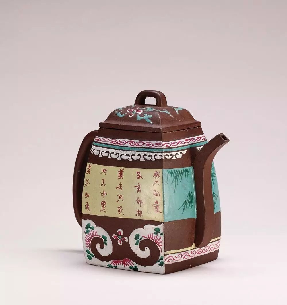 汉方壶是方形紫砂器中经典的一式,据资料记载,早于明有出现,被广泛制作的时期是清中期以后,汉方多大壶,两侧面留白,全身装饰满彩,画工们以高档的胭脂水儿等釉料辅以精湛的绘画功力进行装饰,作品大多尽显盛世之奢华,也有仅以展现汉方壶之雄伟大气的素汉方,用料粗犷、线条挺拔俊朗。
