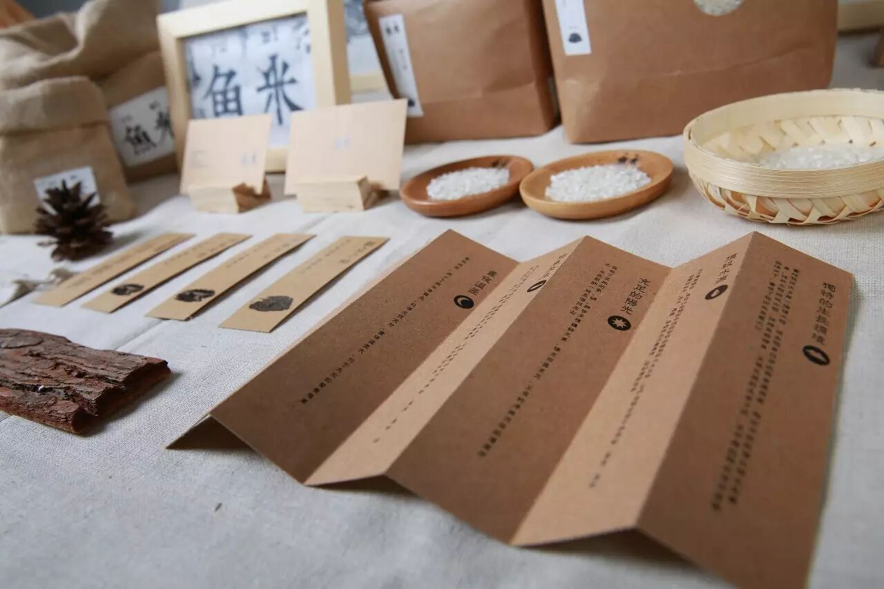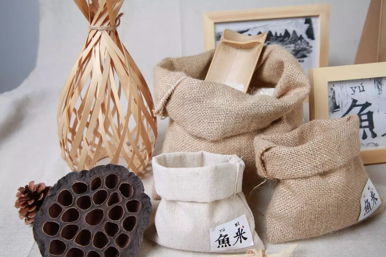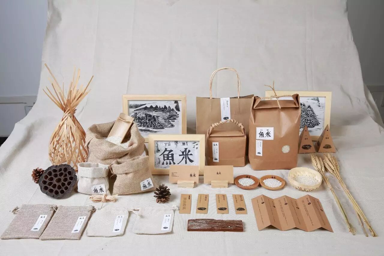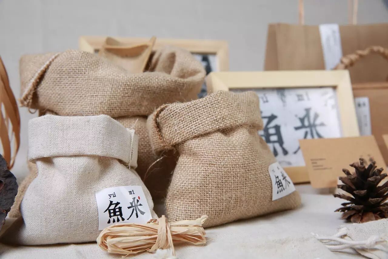 以品牌名称“鱼米”进行设计,将鱼米二字用版刻的形式表现出不一样的肌理效果。包装装饰主要是用版画加logo组合的形式。在材料上选取了颜色:纯白、米黄、黑色、亚麻本色。市场上大米产品的包装大多是用密封的塑料编织袋或抽真空塑料块状结构。这些包装形式的主要功能是保护产品,方便携带与运输。本次设计的产品包装在符合上述包装结构的功能性的基础上,将生态理念运用到大米产品中,既要符合大米包装最基本的易携带、运输功能,还应当具备生态设计要求。因此,在定位产品包装结构时,秉着简洁、自然、绿色环保的原则,以麻袋、牛皮纸袋以及玻璃罐罐为主要结构进行包装设计。