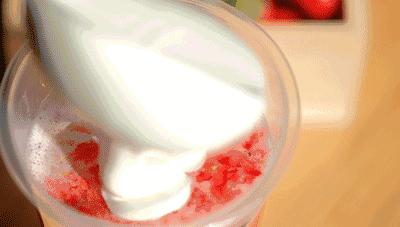 在草莓水果茶上加上一层柔软细滑浓郁的芝士奶盖