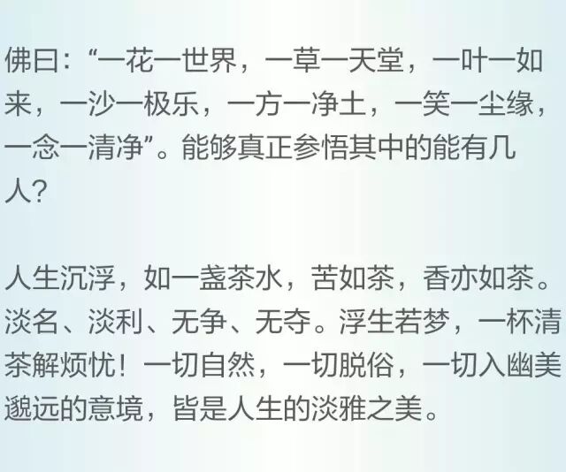 一杯清茶,一颗静心:“茶”字拆开即“人在草木间”。人生一世,草木一秋,几度冷暖,几许纷繁,人与茶之间有着禅意的相连。